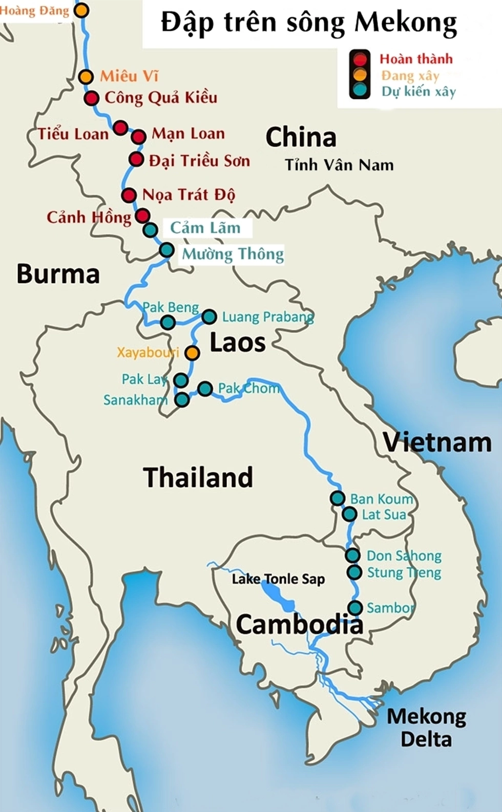 Sông Mekong là một trong những con sông lớn nhất trên thế giới, bắt nguồn từ Trung Quốc, chảy qua Lào, Myanmar, Thái Lan, Campuchia, Việt Nam và đổ ra Biển Đông. Lưu lượng trung bình 13.200 m³/s, vào mùa nước lũ có thể lên tới 30.000 m³/s. Đồ họa: Michael Buckley
