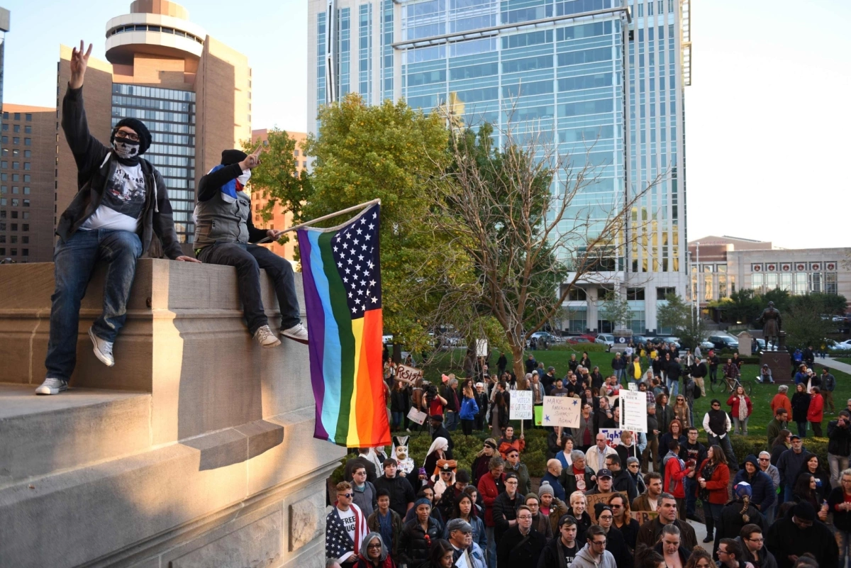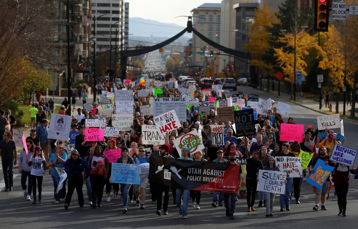 Người biểu tình hôm 12/11 tuần hành ở thành phố Salt Lake City, bang Utah, phản đối ông Trump đắc cử tổng thống Mỹ. Ông Trump, đảng Cộng hòa, vượt qua đối thủ đảng Dân chủ Clinton trong ngày bầu cử 8/11, khi nhận được 290 phiếu đại cử tri. Kết quả này khiến nhiều người bất ngờ, đặc biệt là người ủng hộ đảng Dân chủ.