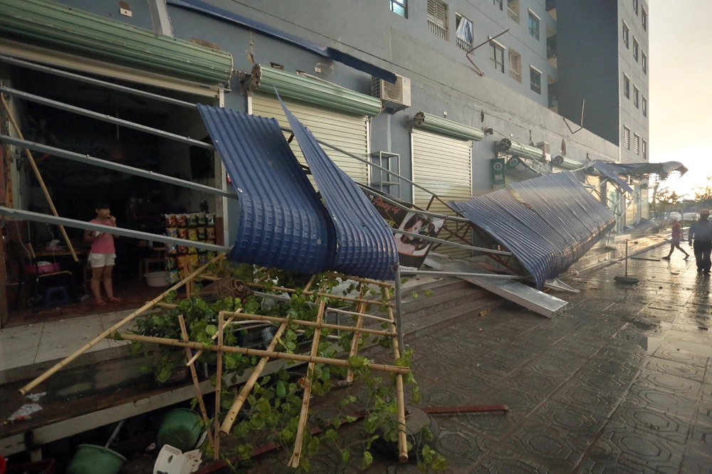 Mái tôn của cả dãy kios bị cuốn phăng và hư hỏng nặng.
