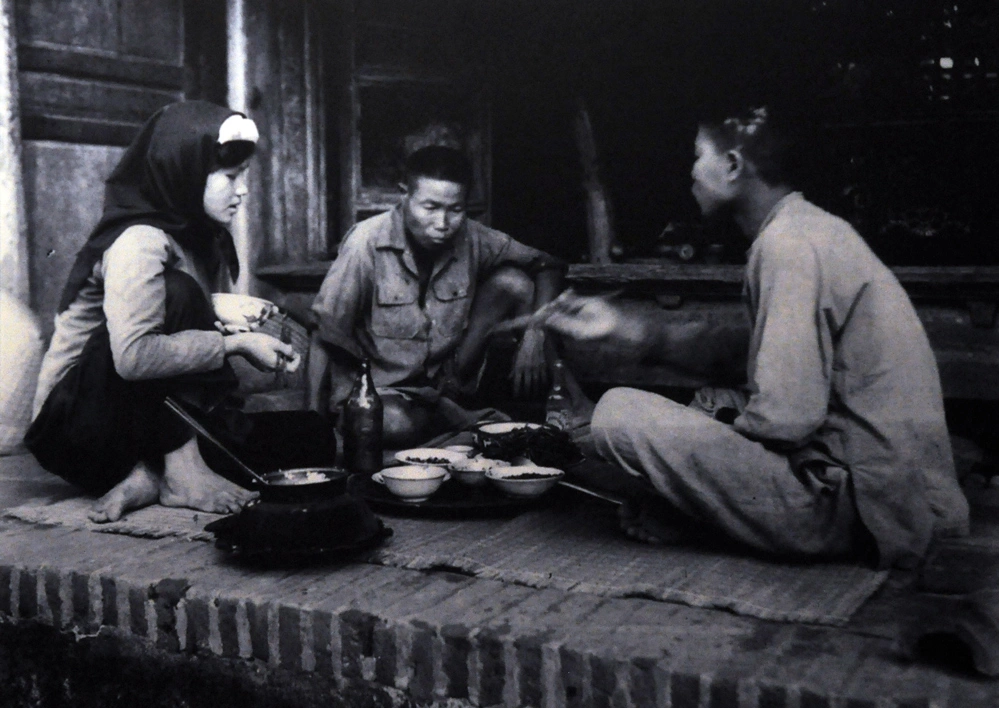Chủ tịch Hồ Chí Minh thăm gia đình chị Bân ở xã Trung Nghĩa, huyện Hiệp Hòa (Bắc Giang), nghe nông dân báo cáo tình hình sản xuất và đời sống của bà con sau khi thực hiện cái cách ruộng đất, ngày 8/2/1955.