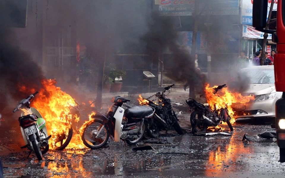 Khi lực lượng cứu hỏa có mặt, cả chục xe máy để trên vỉa hè và lòng đường chỉ còn trơ khung đen.