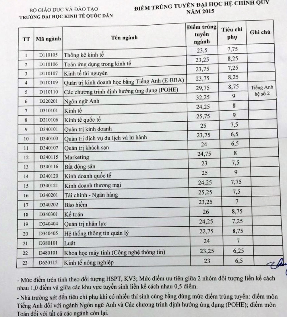 Đại học Kinh tế quốc dân có điểm chuẩn các ngành từ 22,75 đến 32,25. Trong đó, ngành Ngôn ngữ Anh có chuẩn đầu vào cao nhất là 32,25 (đã nhân hệ số 2 môn tiếng Anh) với tiêu chí phụ dành cho các đối tượng bằng điểm là ưu tiên người có điểm tiếng Anh từ 9 trở lên. Trong số ngành lấy điểm các môn nhân hệ số 1, ngành Kế toán và Kinh tế quốc tế có điểm trúng tuyển cao nhất, lần lượt là 26 (tiêu chí phụ cho các thí sinh bằng điểm là ưu tiên điểm Toán đạt 8,75) và 25,75 (ưu tiên Toán trên 8 điểm).