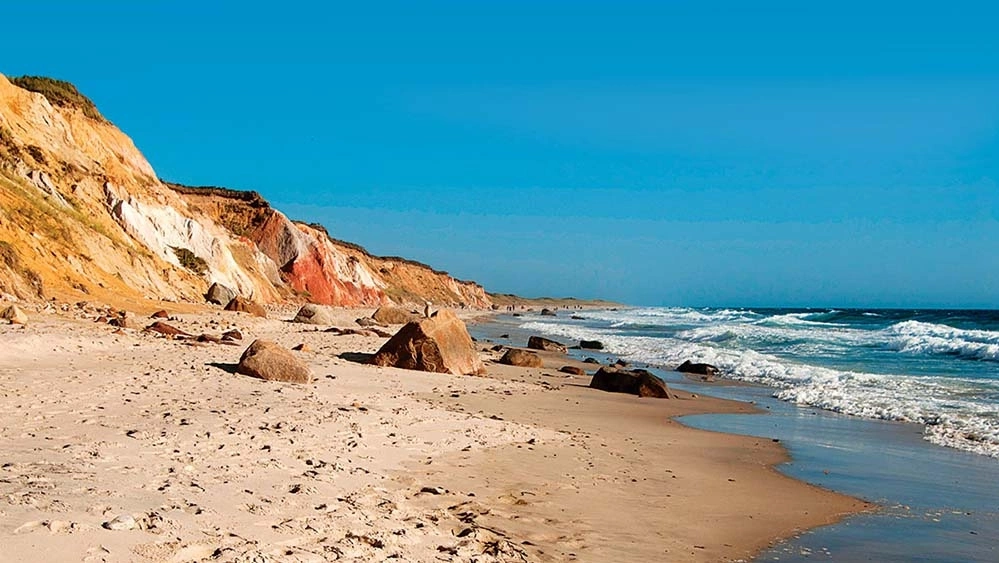 Nằm ở cực tây đảo Martha's Vineyard, bang Massachusetts, Moshup là dải cát dài uốn quanh mũi đất có ngọn hải đăng Gay Head lịch sử, được xây từ năm 1799. Khu vực nằm dưới những vách đá sa thạch màu gỉ sét được công nhận là Di tích thiên nhiên quốc gia từ năm 1966, cho phép mọi người tùy chọn trang phục để tắm. Ảnh: Boston Magazine