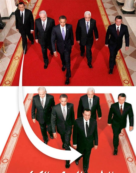 | Giữa tháng 9, tờ báo phổ biến nhất Ai Cập Al-Ahram bị chỉ trích mạnh mẽ vì "hoán đổi" Tổng thống Hosni Mubarak từ vị trí cuối cùng lên trước các nguyên thủ Mỹ, Israel, Palestine và Jordan trong cuộc đàm phán về hòa bình Trung Đông . Ảnh: Gizmodo. |
