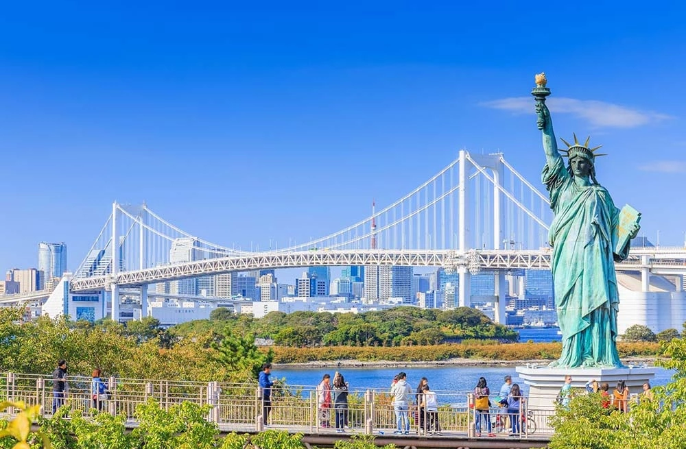 Tượng nằm ở trên vịnh Tokyo, dễ tiếp cận. Sau lưng bức tượng là một cây cầu treo dài, khiến du khách có thể liên tưởng mình đang ngắm bản gốc ở New York. Ảnh: Go Tokyo