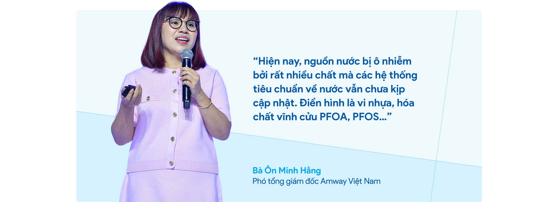 Sau buổi vinh danh, bà Ôn Minh Hằng, Phó tổng giám đốc Amway Việt Nam chia sẻ về những dấu mốc trong 40 năm nghiên cứu phát triển New eSpring và vai trò của những công nghệ lọc nước mới trong việc chăm sóc sức khỏe cho người Việt.