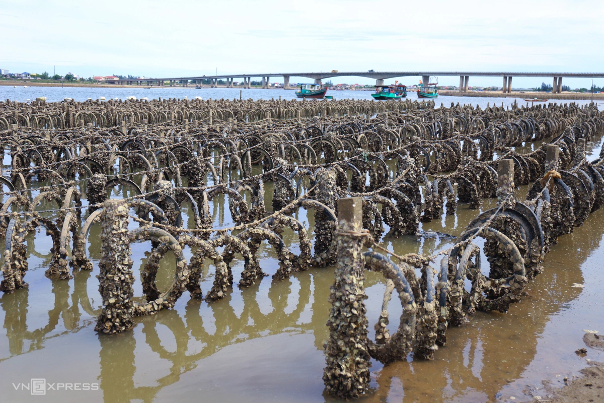 Lốp xe được buộc san sát trên các sợi dây vắt ngang trụ bêtông, xung quanh bám đầy hàu. Thời điểm này đang vào mùa thu hoạch hàu.