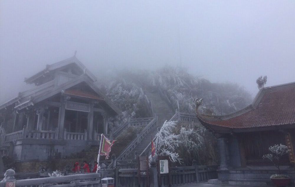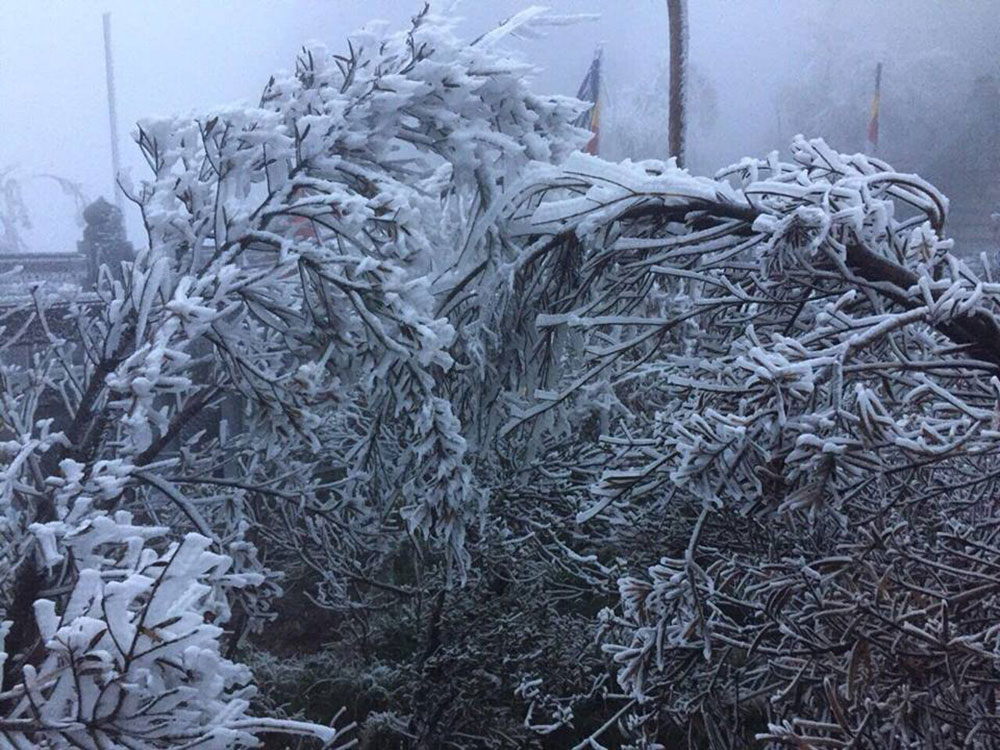 Từ đêm 6/4, thị trấn Sa Pa (Lào Cai) có mưa nhỏ, sáng 7/4 nền nhiệt là 5 độ. Tại đỉnh Fansipan - nơi cao 3.143 m so với mực nước biển - nhiệt độ dưới 0, xuất hiện lớp băng khá dày.