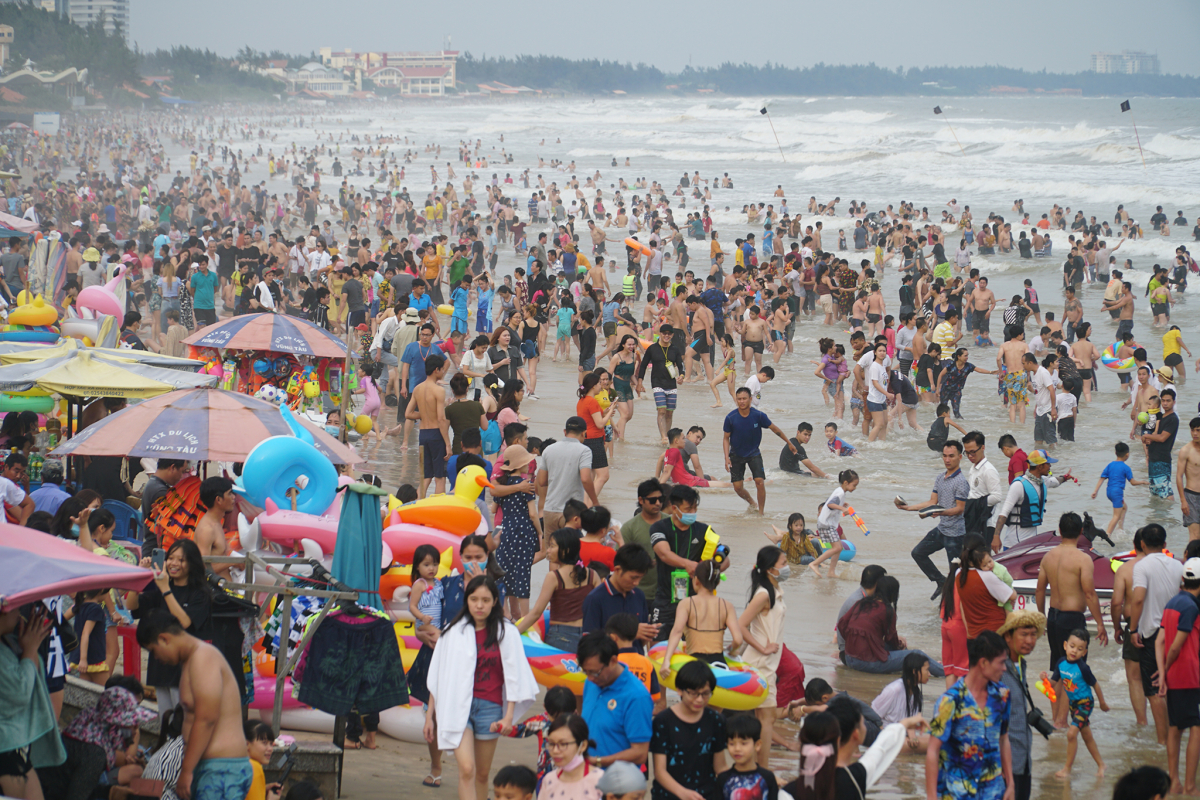 Mọi khi khách tắm phân tán dọc bãi biển dài gần 10 km, hôm nay họ tập trung đông đúc ở đoạn từ quảng trường Cột Cờ về phía Chí Linh.