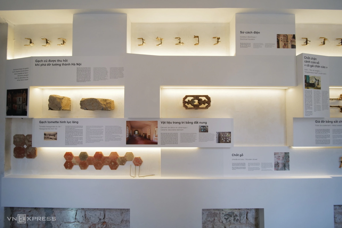Một số hiện vật được trưng bày tại tầng 1 như gạch, sứ cách điện, vật liệu trang trí bằng đất nung, các giá đỡ bằng sắt chôn trong tường, mảnh gỗ bị mối mọt...