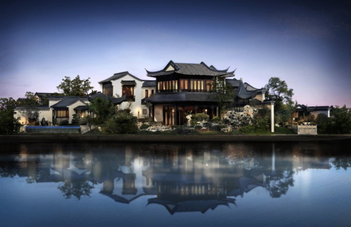 Đào Hoa Nguyên nằm ven hồ Độc Thự, thành phố Tô Châu, tỉnh Giang Tô. Biệt thự này được công ty khai thác bất động sản Sunac bỏ vốn xây dựng trong ba năm.