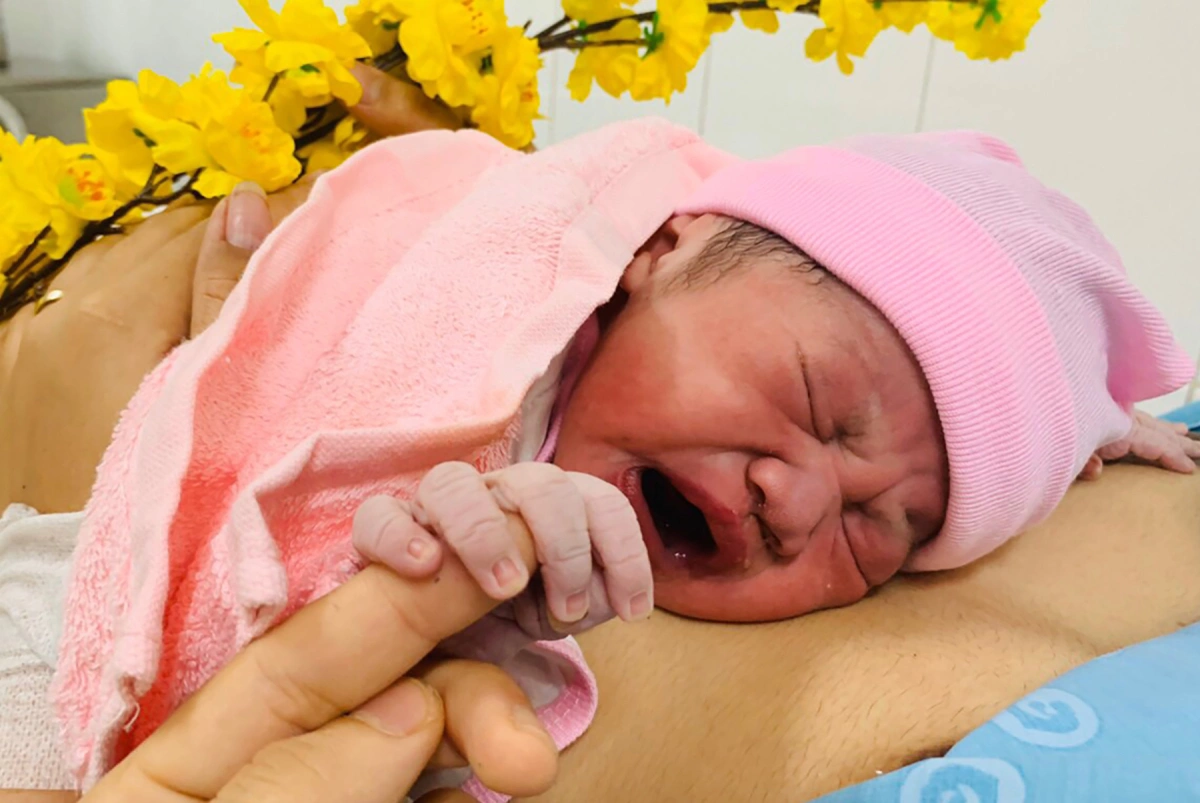 Vài phút sau, cũng tại Bệnh viện Phụ sản Thành phố Cần Thơ, người mẹ 29 tuổi cùng y bác sĩ chào đón chàng hoàng tử cân nặng 3,1 kg, khóc vang. Sau sinh, bé trai được tiếp xúc da kề da với mẹ.