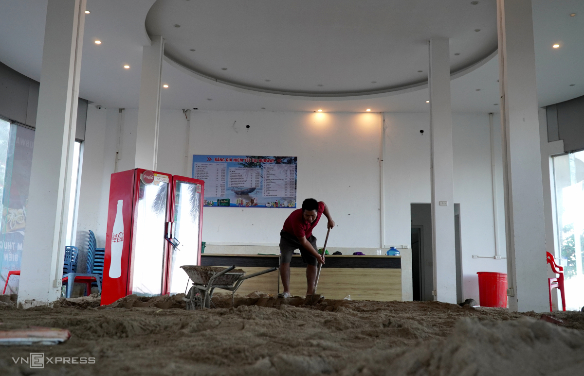 Bên trong hubway (quầy bar, cà phê, đồ ăn nhanh) số 9, cát ngập sâu 60-70 cm. Đơn vị quản lý phải thuê người xúc vận chuyển ra ngoài.