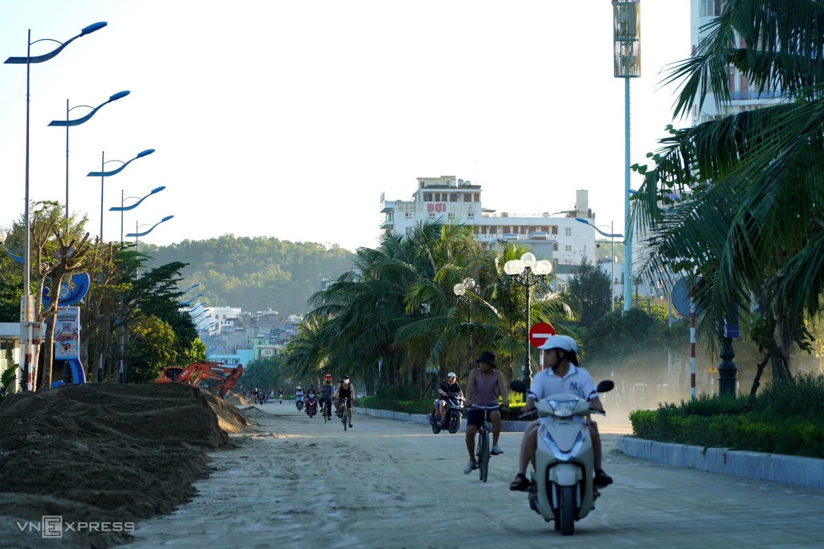 Người dân băng qua tuyến đường ngập cát ở Sầm Sơn. Triều cường đã cuốn hàng nghìn m3 cát tràn lên đường phố Sầm Sơn. Chính quyền phường huy động máy xúc, ôtô vận chuyển cát trở lại bãi biển.