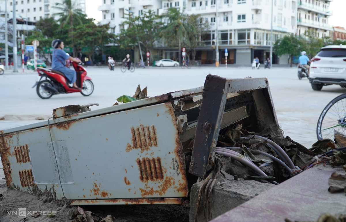 Tại trung tâm bãi tắm B Sầm Sơn, một trụ điện bị gió bão quật đổ, nằm ngổn ngang. Hệ thống điện ngầm và nước sạch ven biển bị sóng đánh đứt gãy nhiều đoạn.