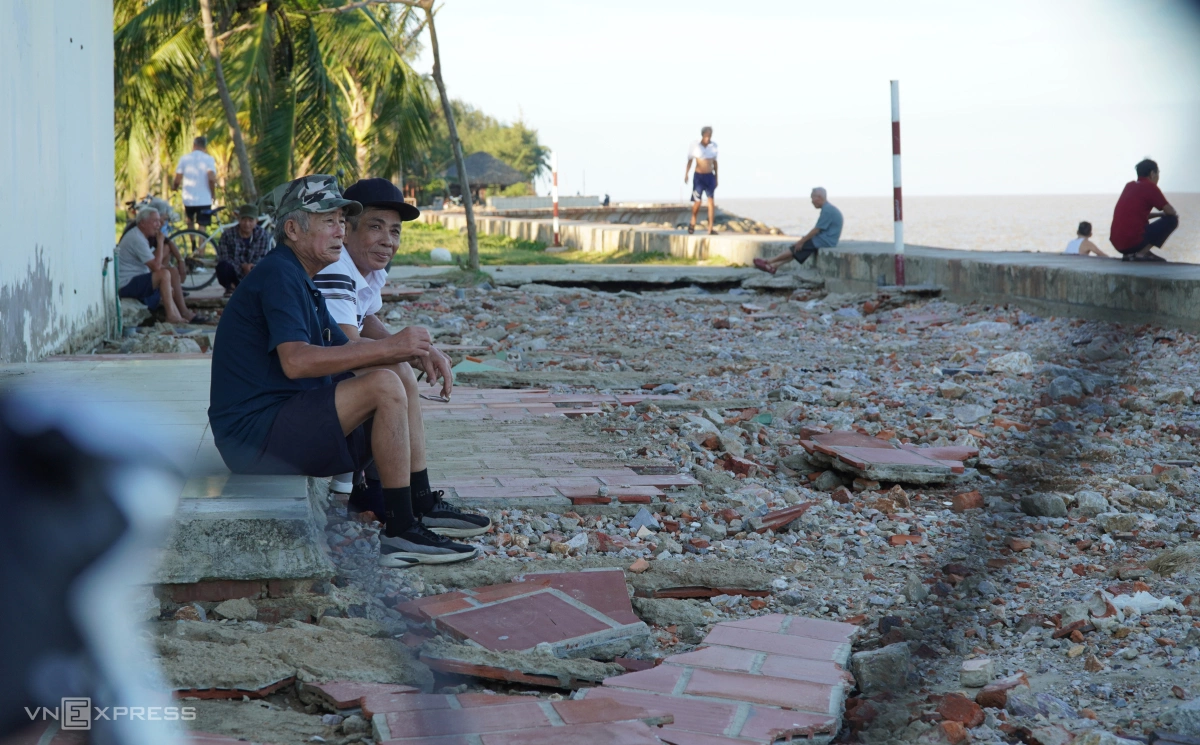 Trên bờ biển Sầm Sơn, hai người đàn ông ngồi hóng mát bên cạnh là nhà hàng bị hư hỏng và nền gạch bị sóng xé nát.