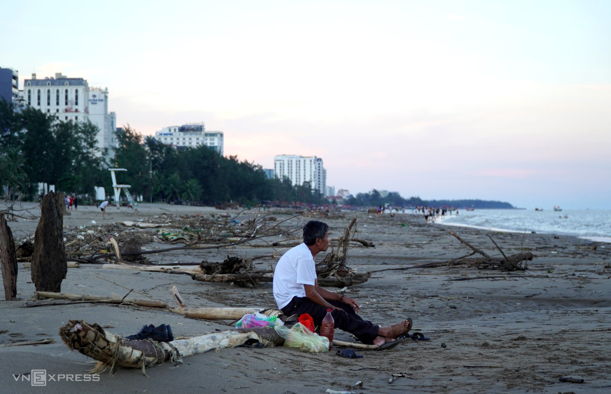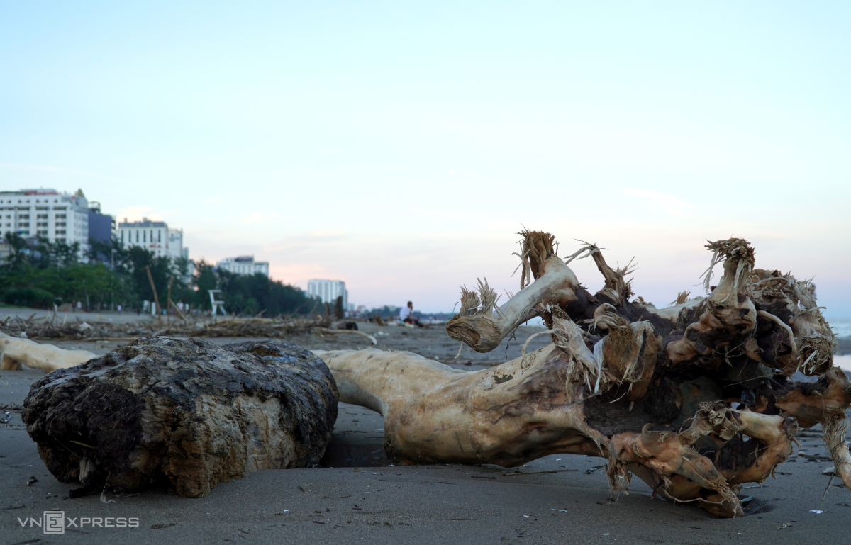 Sau bão Bualoi, rác thải ngập tràn bờ biển Sầm Sơn, nhiều thân cây lớn nặng hàng trăm kg vẫn chưa được thu dọn.