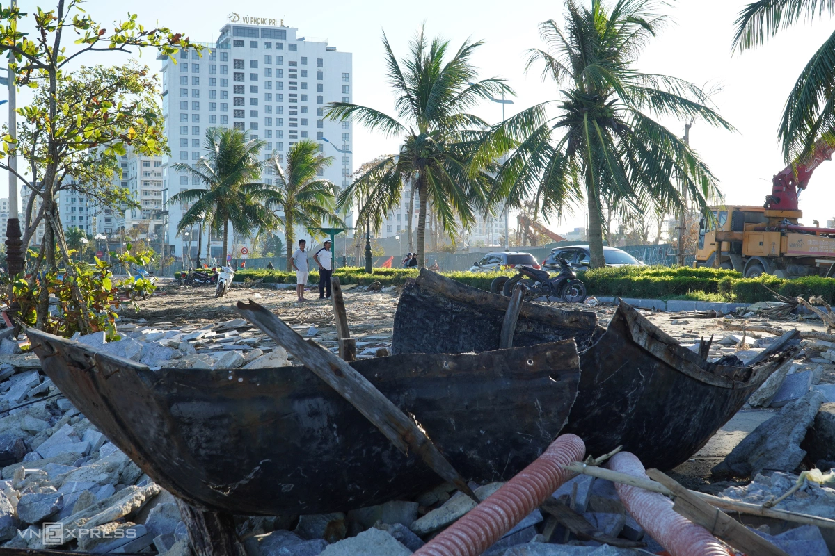 Thuyền đánh cá của ngư dân phường Sầm Sơn bị sóng phá hỏng, trôi dạt vào bờ, sáng 4/10.