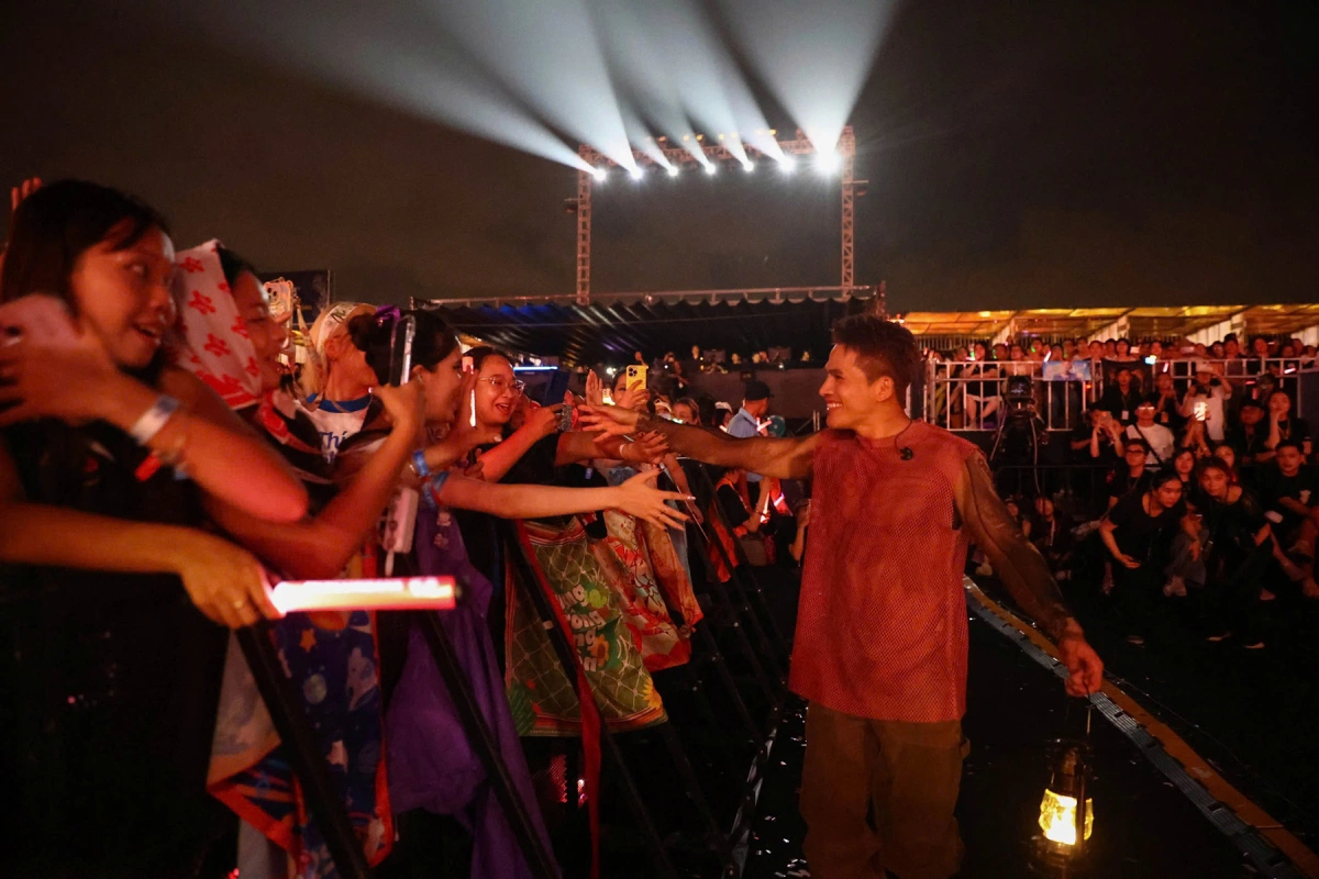 Quốc Thiên trong bản Thu hoài. Nhiều fan phấn khích khi ca sĩ xuống sân khấu bắt tay từng người.