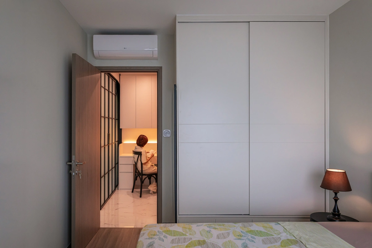 Phòng ngủ và không gian sinh hoạt chung được ngăn cách bởi hệ cửa đóng mở linh hoạt, đảm bảo sự riêng tư cho mỗi khu vực.