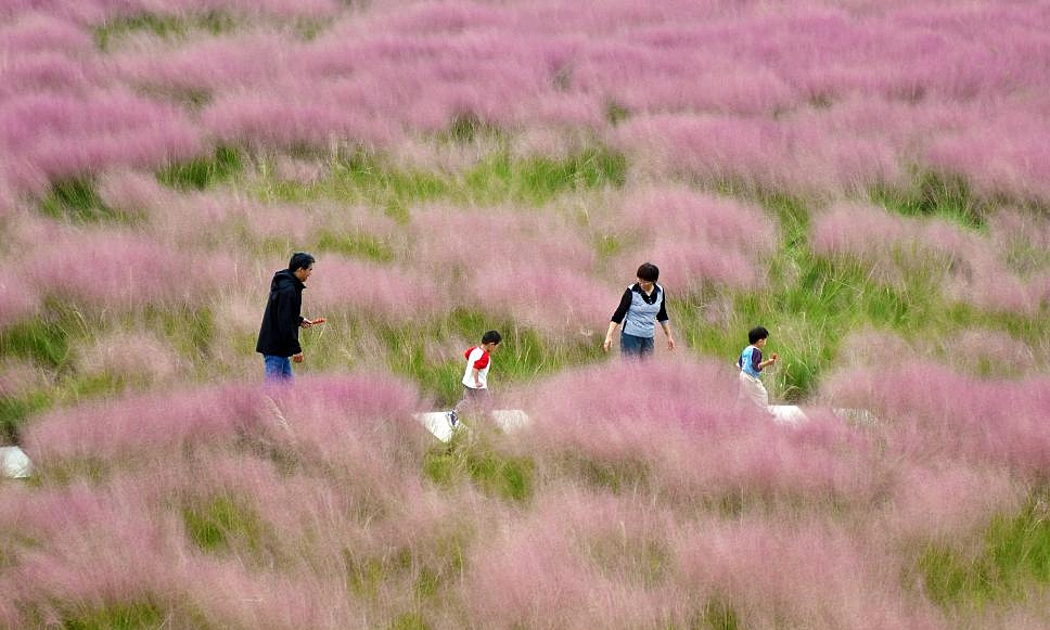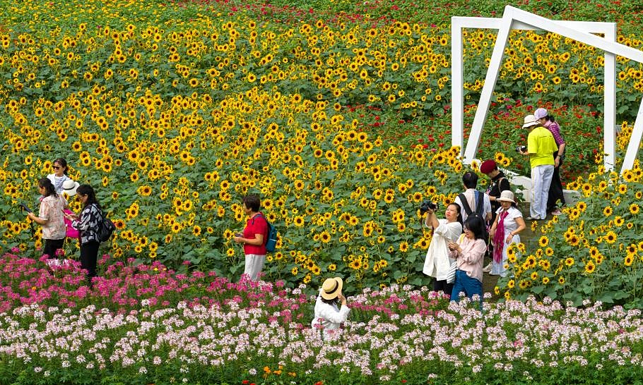 Du khách tham quan cánh đồng hoa tại thành phố Côn Sơn, tỉnh Giang Tô, miền Đông Trung Quốc, ngày 17/10. Đây là một trong những cánh đồng hoa lớn của thành phố, thu hút đông khách tham quan và nhiếp ảnh gia vào mùa thu. Ảnh: Wang Xuzhong/Xinhua
