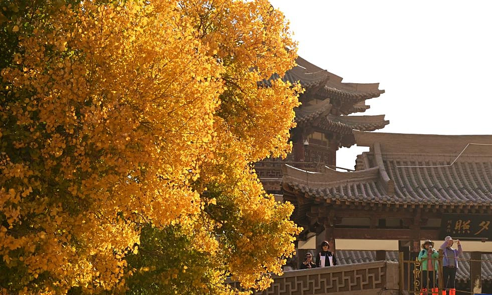 Du khách chụp ảnh bên những cây dương liễu tại Khu thắng cảnh Núi Mạc Sa và Suối Lưỡi Liềm, thành phố Đôn Hoàng, tỉnh Cam Túc, Tây Bắc Trung Quốc, ngày 18/10. Khu thắng cảnh nổi tiếng với cảnh sa mạc kết hợp ốc đảo nước ngọt, thu hút nhiều khách tham quan và nhiếp ảnh gia. Ảnh: Zhang Xiaoliang/Xinhua