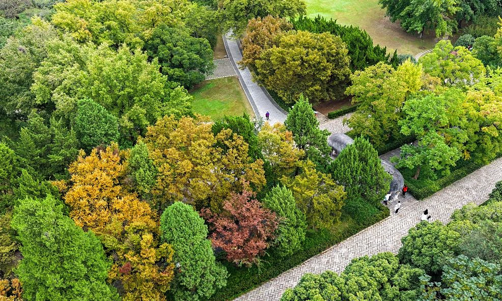 Ảnh chụp từ drone ngày 17/10 tại Minh Hiếu lăng ở Nam Kinh, Giang Tô cho thấy lá xanh bắt đầu chuyển vàng, đỏ. Minh Hiếu lăng là điểm tham quan nổi tiếng ở Nam Kinh, nơi đây là lăng mộ hợp táng của Hoàng đế Minh Thái Tổ Chu Nguyên Chương. Khu lăng mộ nổi tiếng với kiến trúc hoàng gia cổ kính, lối đi trải dài rợp bóng cây, là điểm đến hút khách tham quan vào mùa thu. Ảnh: Fang Dongxu/Xinhua
