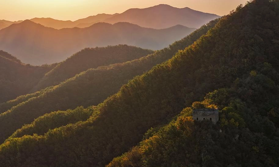 Ảnh chụp từ trên cao cảnh sắc mùa thu tại Vạn Lý Trường Thành Thanh Sơn Quan, ở thị trấn Thượng Ứng, huyện Kiến Tế, thành phố Đường Sơn, tỉnh Hà Bắc, miền Bắc Trung Quốc, ngày 18/10. Đoạn tường thành cổ uốn lượn qua núi non, với những rừng cây đang thay màu lá. Ảnh: Liu Mancang/Xinhua