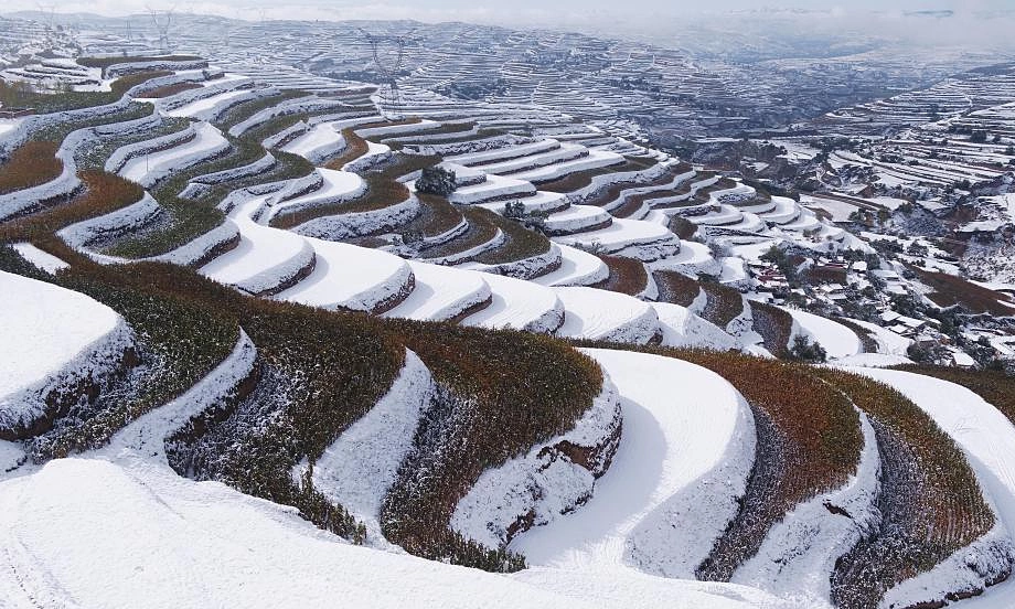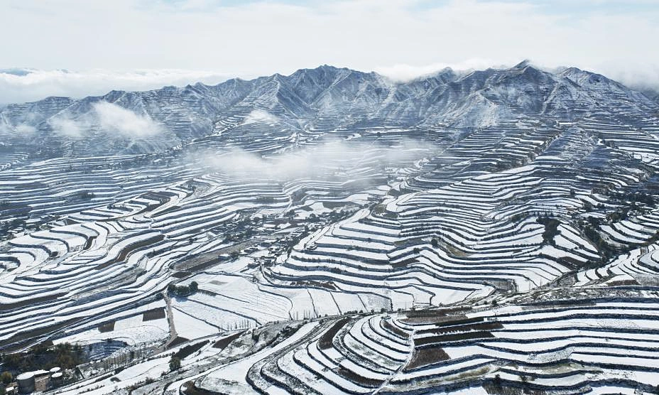 Ruộng bậc thang ở Trần Kinh, huyện Vĩnh Kinh, tỉnh Cam Túc, phủ lớp tuyết đầu mùa, ảnh chụp ngày 17/10. Ảnh: Shi Youdong/Xinhua