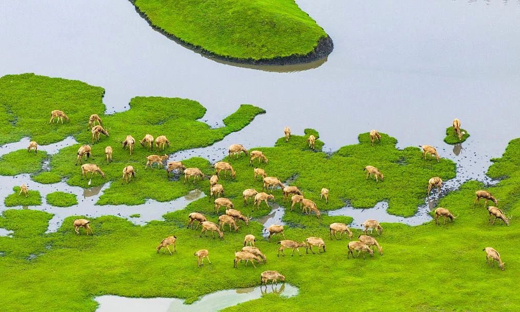 Cảnh đàn hươu Milu băng qua sông tại công viên đất ngập nước ở quận Giang Diên, thành phố Thái Châu, tỉnh Giang Tô, miền Đông Trung Quốc, ngày 17/10. Công viên rộng gần 670 ha, được phục hồi sinh thái qua ba giai đoạn từ năm 2000, với hơn 4,6 triệu cây xanh và 1,8 triệu cây thủy sinh được trồng. Công viên là nơi sinh sống của nhiều loài động vật quý hiếm, bao gồm hươu Milu, loài động vật được bảo vệ cấp quốc gia. Ảnh: Zhou Shegen/Xinhua