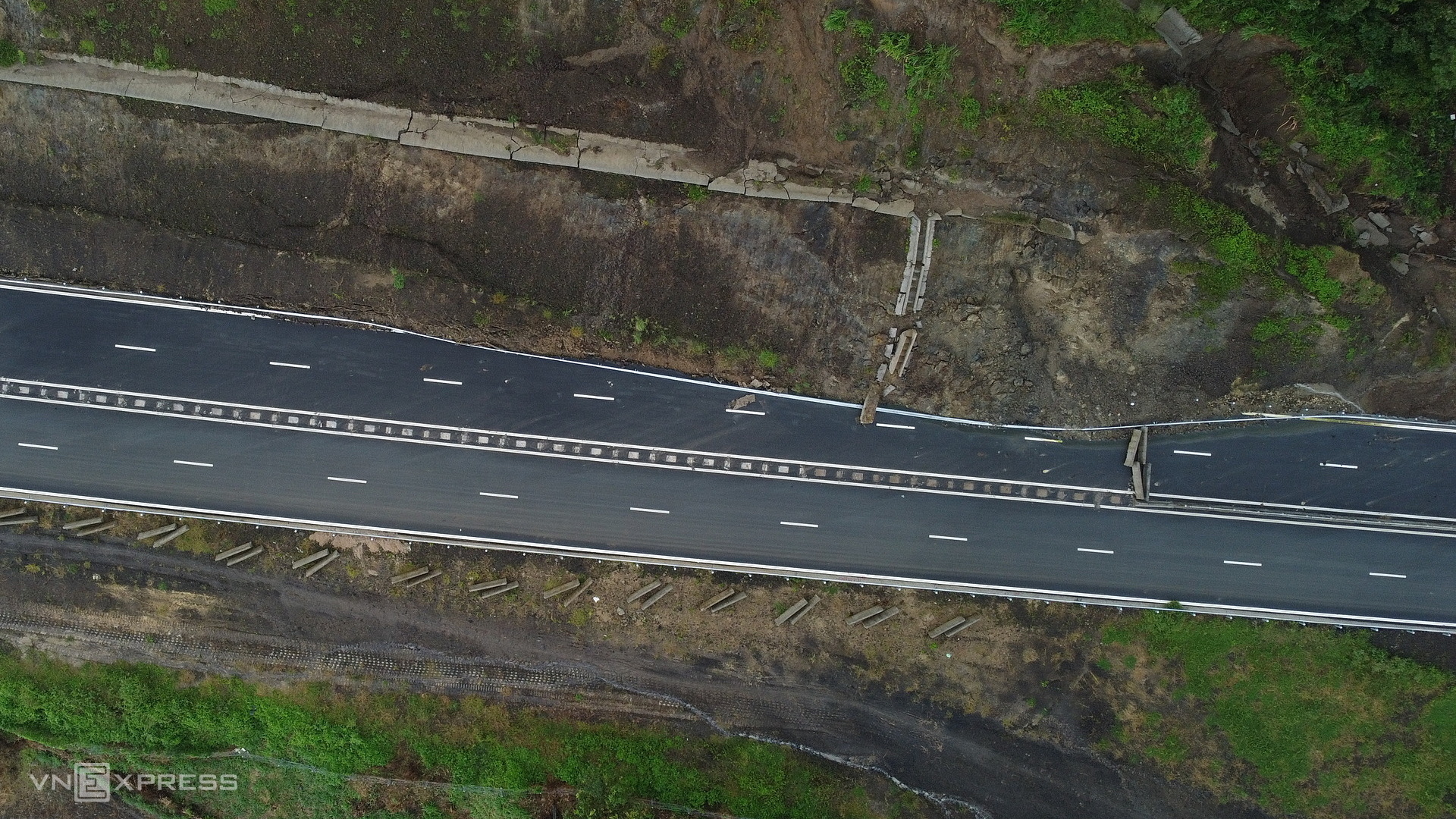Quanh vết nứt, mặt đường cao tốc bị lồi lõm do tác động của sạt trượt.