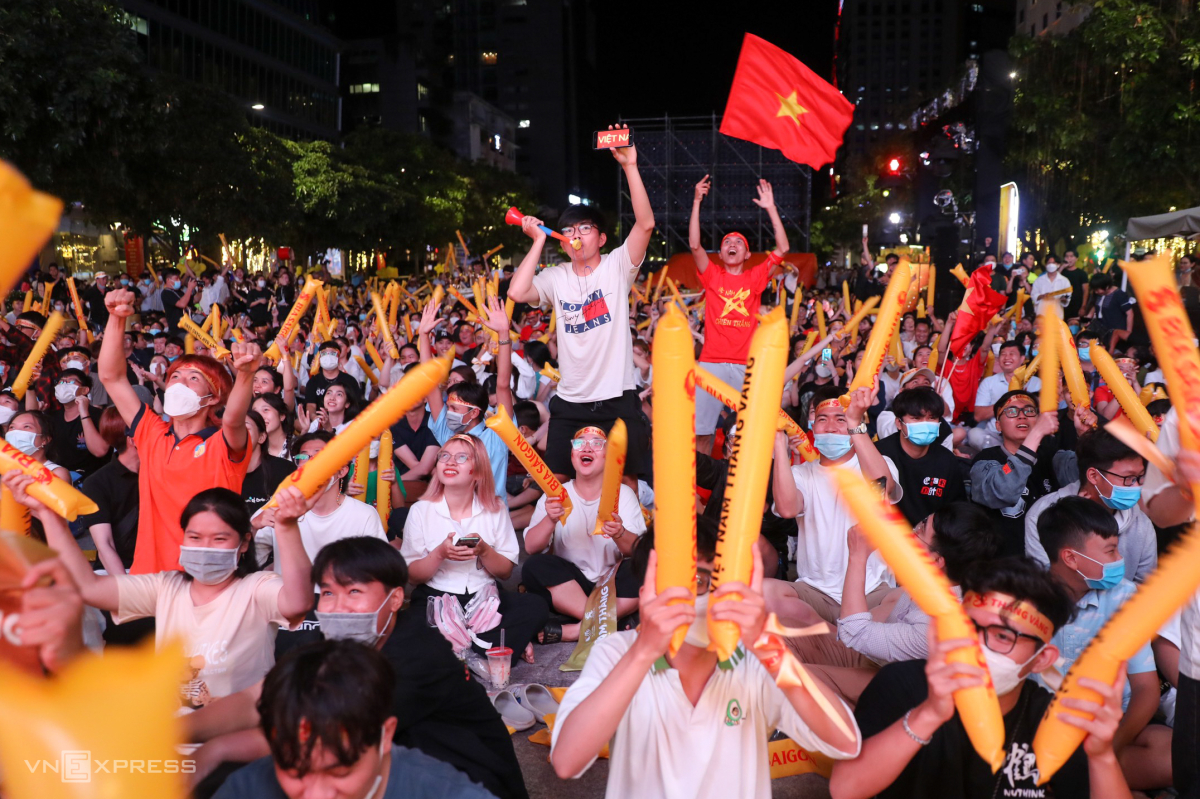 Trước đó, từ 18h, hàng nghìn người có mặt tại phố Nguyễn Huệ để theo dõi trận đấu. Tại đây, 5 màn hình led kích thước lớn được lắp đặt phục vụ người hâm mộ, sau hơn hai năm hoạt động bóng đá ở đây bị ngưng để phòng dịch.