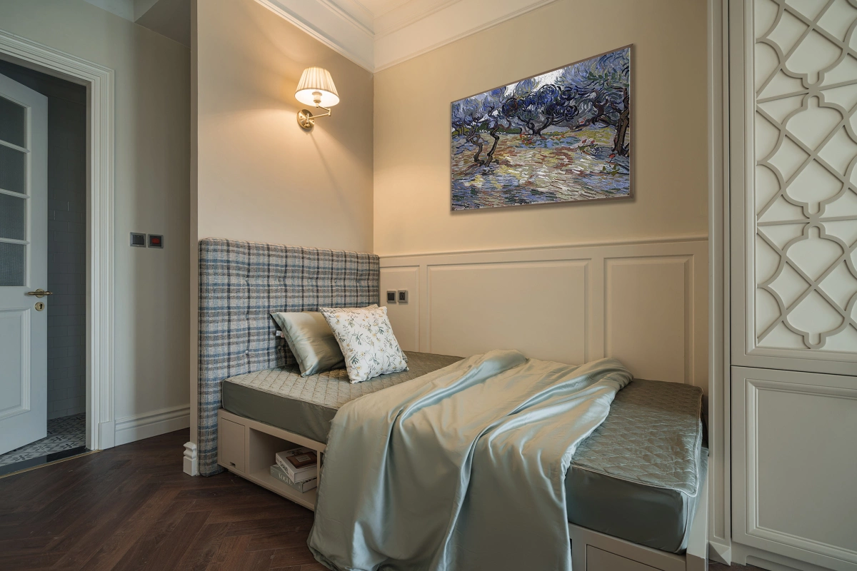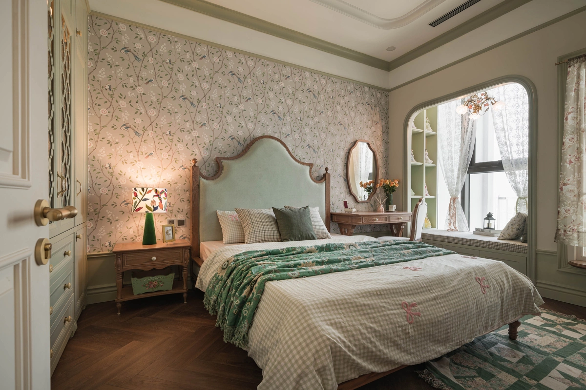 Phòng ngủ chính mang gam màu xanh chủ đạo cùng hoạ tiết giấy dán tường hoa, gợi nhắc đến hình ảnh đồng quê yên bình nơi nông trại châu Âu.