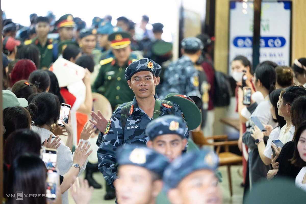 Chiến sĩ Lê Văn Hiền thuộc Lực lượng tác chiến không gian mạng tạm biệt những người ra ga tiễn.