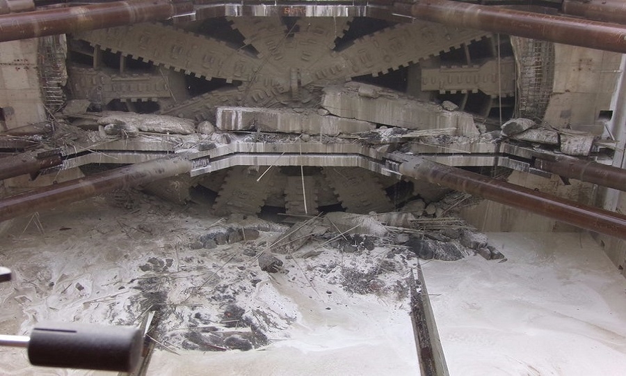 Vào lúc 9h45, cảnh tượng đột ngột thay đổi khi dòng nước bọt pha lẫn bùn đất phun ra từ chân cửa chắn, làm ngập hố. Cùng lúc, đĩa cắt khổng lồ của cỗ máy tiếp xúc với mặt trong của cửa chắn, kéo theo từng đám bụi trắng bốc lên mờ mịt.