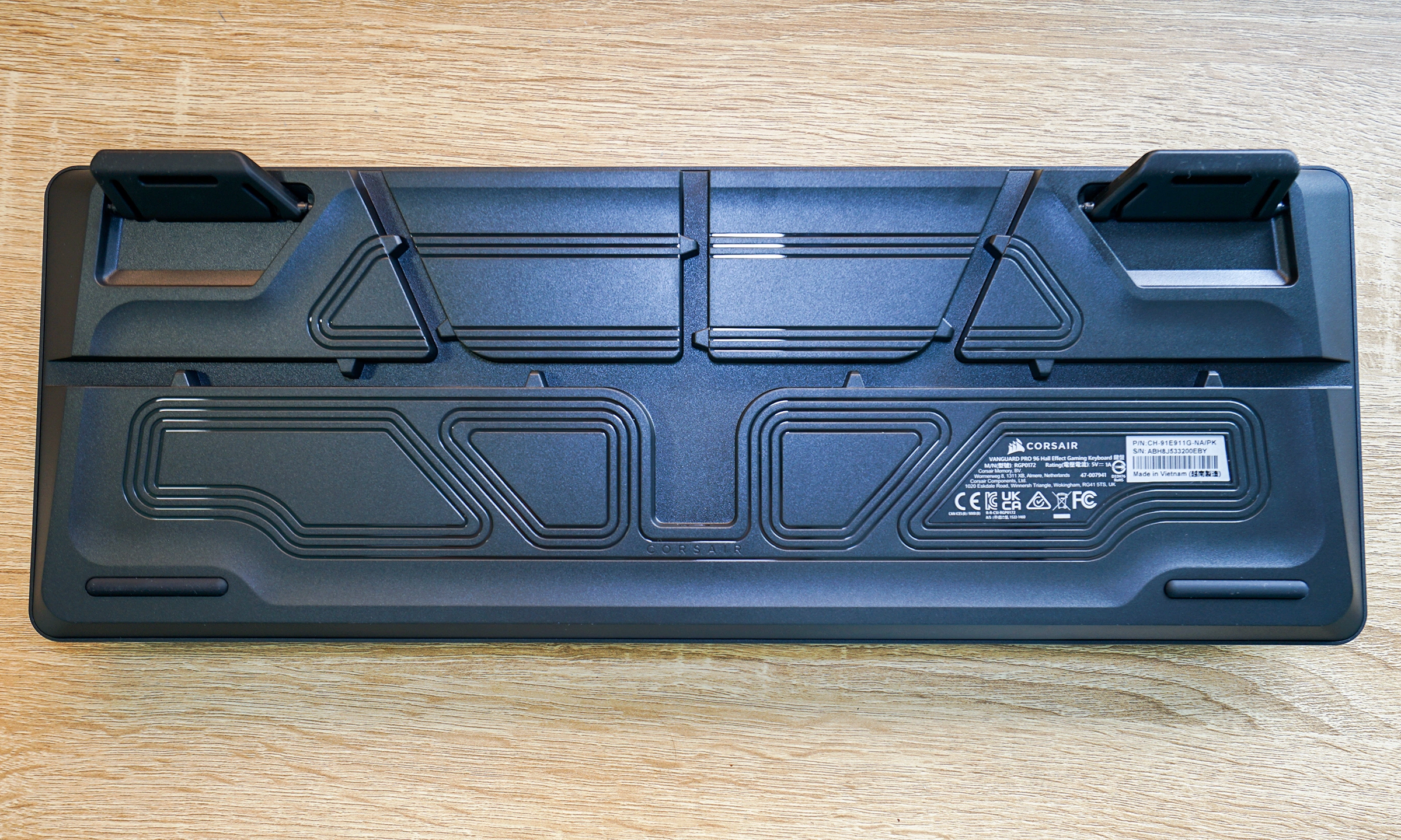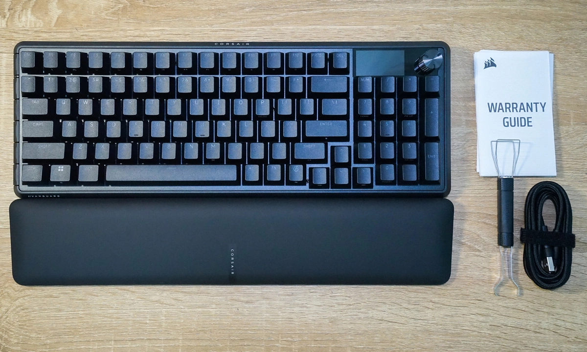 Khung của bàn phím kết hợp nhựa cứng với tấm plate kim loại bên trong, mang lại cảm giác chắc chắn. Corsair tích hợp nhiều lớp foam giảm âm bên trong giúp âm thanh phát ra khá dày, êm khi gõ, không có cảm giác "rỗng" như nhiều bàn phím cơ gaming truyền thống. Dù vậy, chất liệu nhựa bên ngoài chưa thực sự mang lại cảm giác cao cấp, nhất là khi thiết bị có giá bán ở phân khúc 6 triệu đồng.
