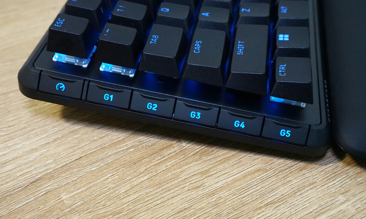 Ở phía bên trái, Corsair bổ sung cụm phím macro (từ G1 đến G5) chuyên dụng cho phép người dùng gán lệnh nhanh hoặc macro phức tạp, bên cạnh phím kích hoạt nhanh chế độ tốc độ cao Game Mode. Đây được xem là điểm cộng khi nhiều bàn phím cùng phân khúc thường loại bỏ cụm phím này để tiết kiệm diện tích.