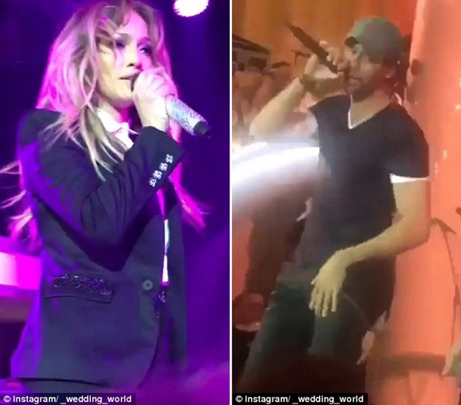 Ca sĩ Jennifer Lopez (trái) và Enrique Iglesias biểu diễn trong lễ cưới. Lopez đùa rằng phát âm đúng tên cô dâu chú rể là "việc khó nhất tôi phải làm ngày hôm nay".