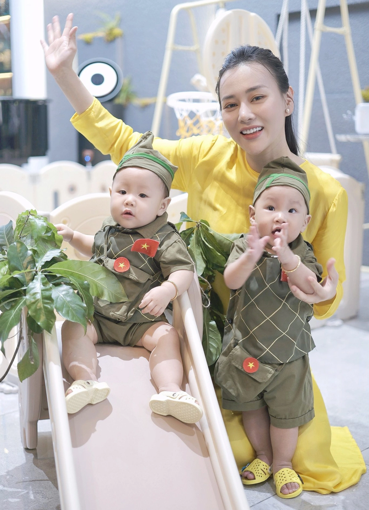 Hình ảnh bé út Q Junior, sáu tháng tuổi, nhận được hàng nghìn lượt yêu thích trên trang cá nhân của Vân Trang. "Tôi thấy các cửa hàng quần áo bán những bộ đồ lấy cảm hứng của người lính dễ thương nên sắm cho các con, hướng đến ngày lễ lớn của dân tộc", diễn viên cho biết.