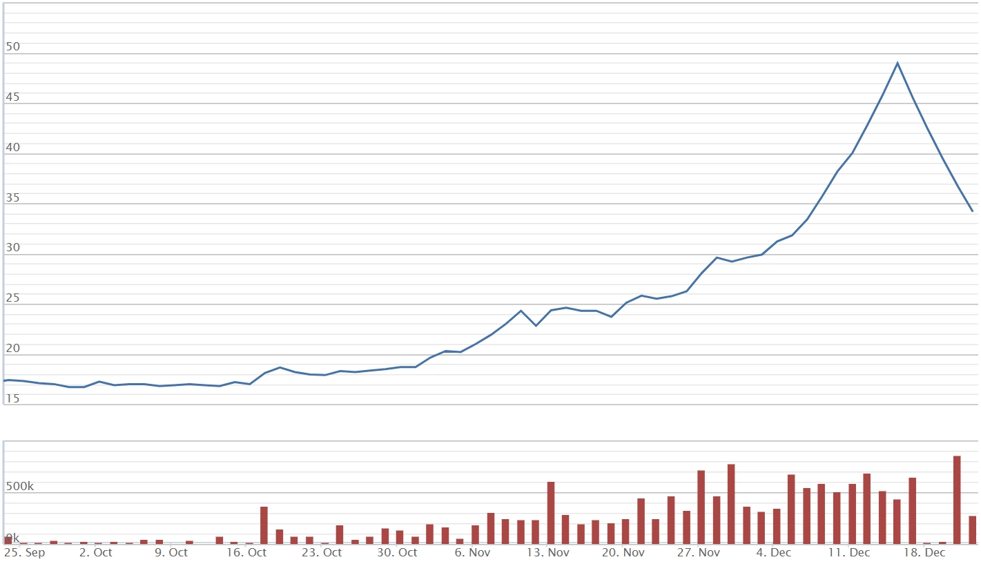 Sau 4 phiên tăng trần liên tiếp, cổ phiếu này đạt gần 50.000 đồng với tỷ suất sinh lời hơn 30%. Một con số ấn tượng sau một tuần giao dịch.