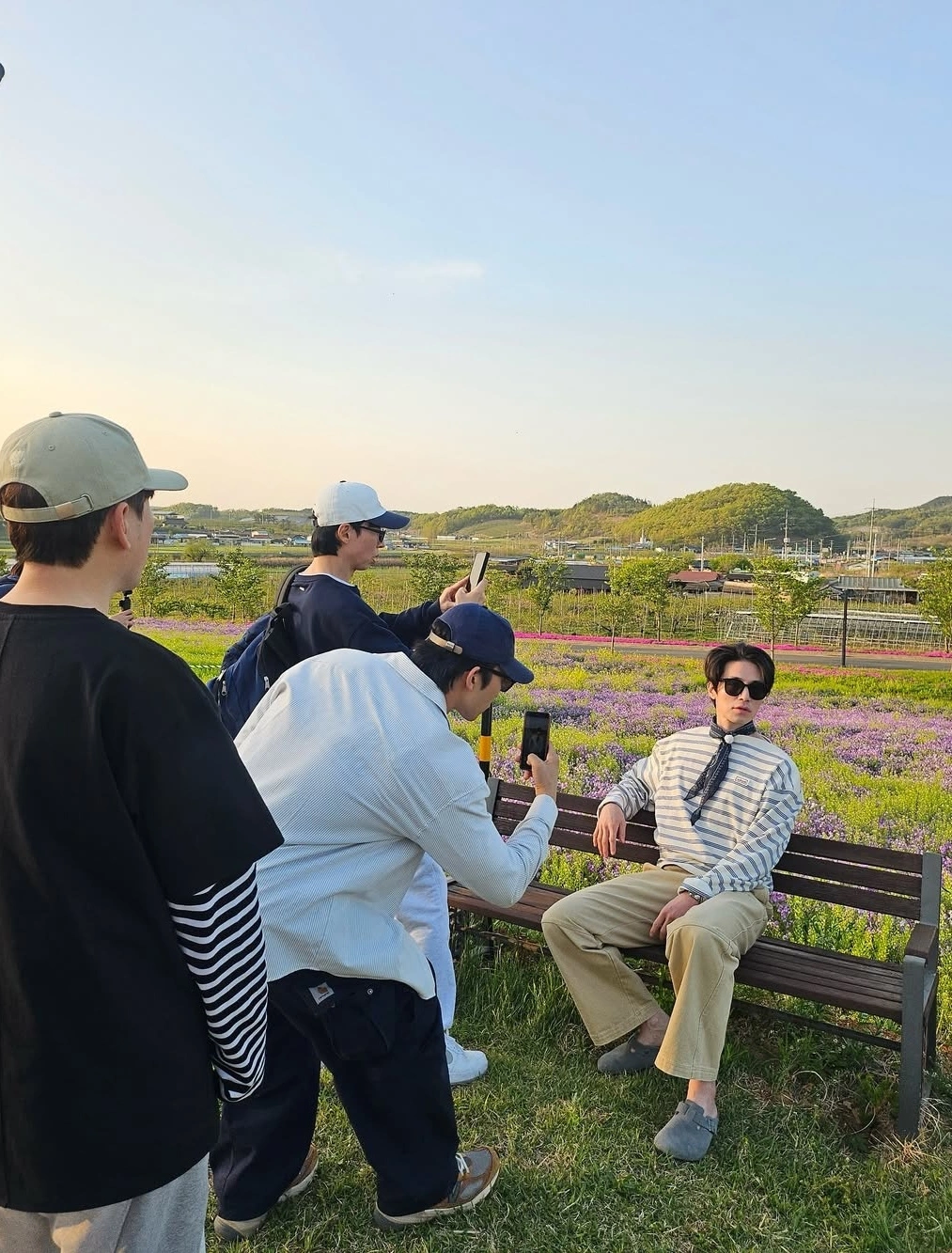 Nhiều nghệ sĩ Hàn nói hiếm sao nam nào có làn da đẹp như Lee Dong Wook, theo Osen. Ảnh "MC quốc dân" Yoo Jae Suk, diễn viên hài Jo Se Ho, Nam Chang Hee chụp Lee Dong Wook trước thảm hoa nhận gần 900.000 lượt thích trên Instagram. Ảnh: Instagram Leedongwook_official