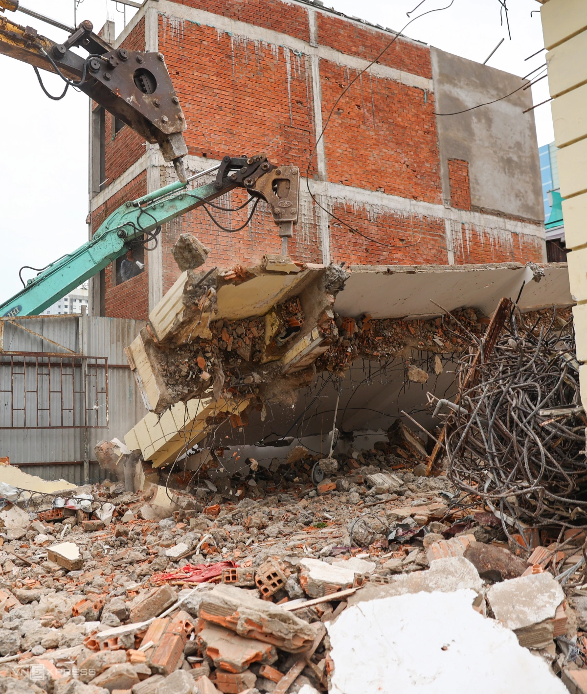 Anh Nguyễn Minh Thương, 26 tuổi, gom các tấm tôn, sắt thép lại điểm tập kết. "Việc dỡ nhà chỉ mất một tuần là xong, tốn thời gian nhất là công đoạn lọc lấy sắt thép trong các kết cấu bêtông", anh nói.
