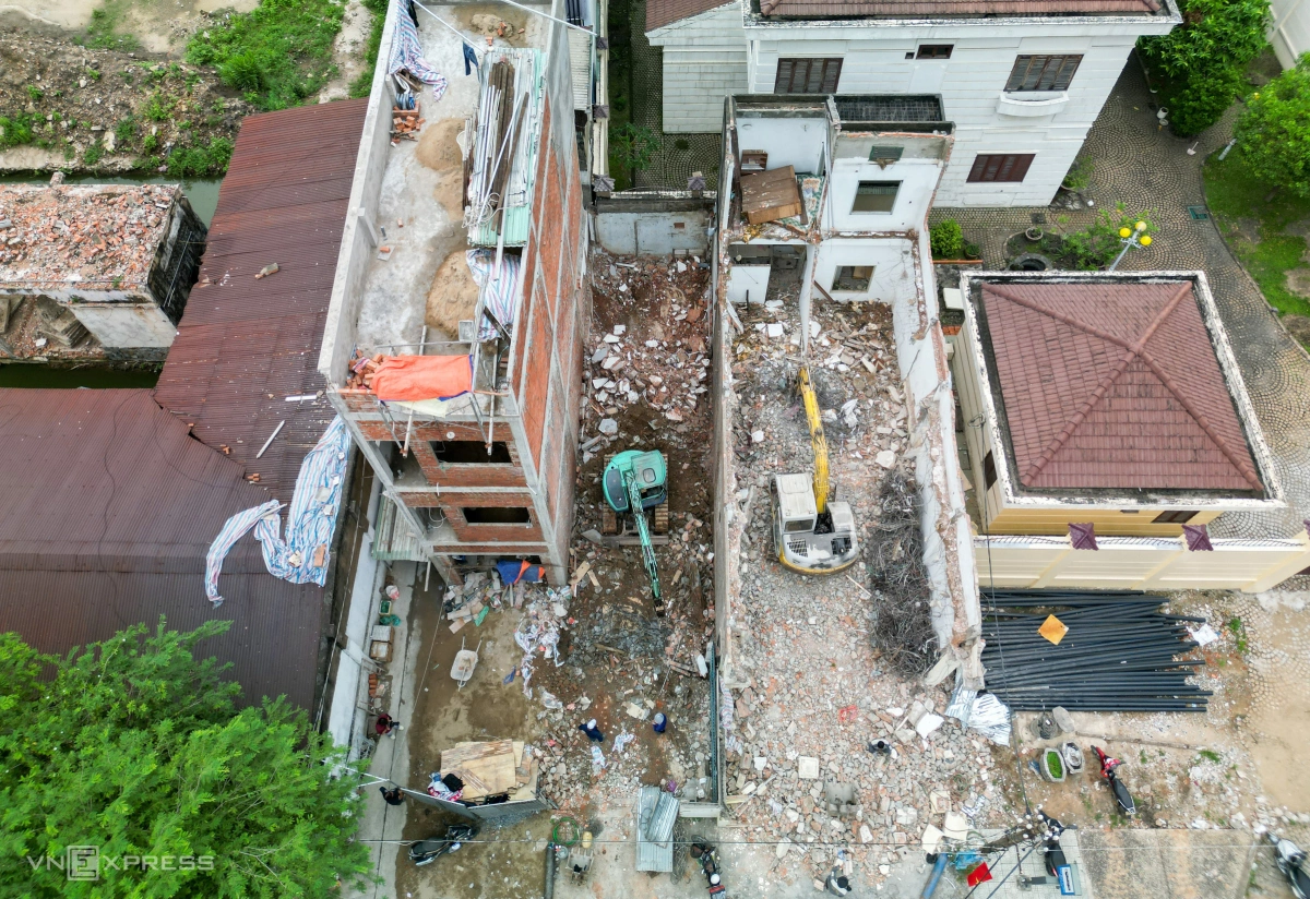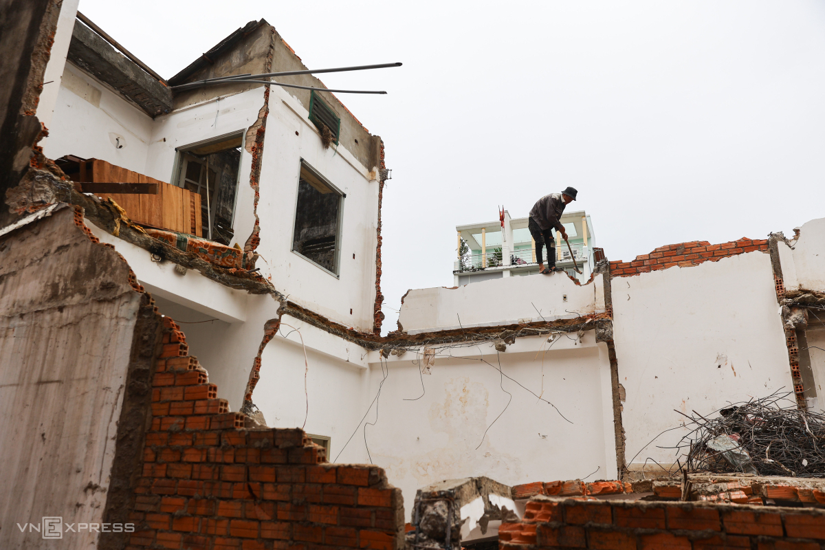Ở ngôi nhà kế bên, anh Tô Quang Hưng (25 tuổi) dùng búa đập vỡ những mảng tường. Một chủ nhà cho biết, nếu chấp nhận đền bù sẽ được hỗ trợ chi phí tháo dỡ 8-9 triệu đồng một m2.
