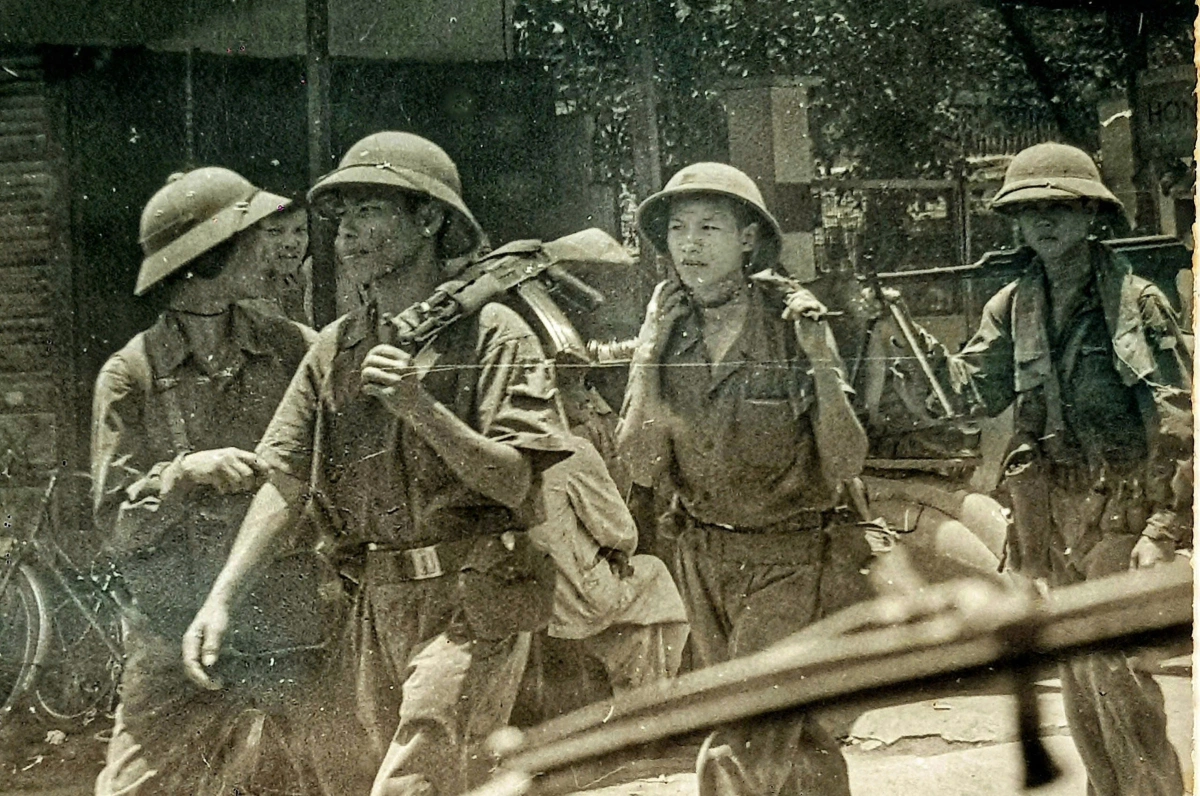 Trong một số tấm ảnh đầu ông chụp lúc 9h30 là hình ảnh bộ đội mang súng AK, B40 đi qua khu vực nhà mình. Đoàn người mang quân phục màu xanh, đội mũ cối, tai bèo, đi dép râu cao su đặc trưng của bộ đội thời bấy giờ. Khuôn mặt của họ khá căng thẳng và nghiêm nghị.