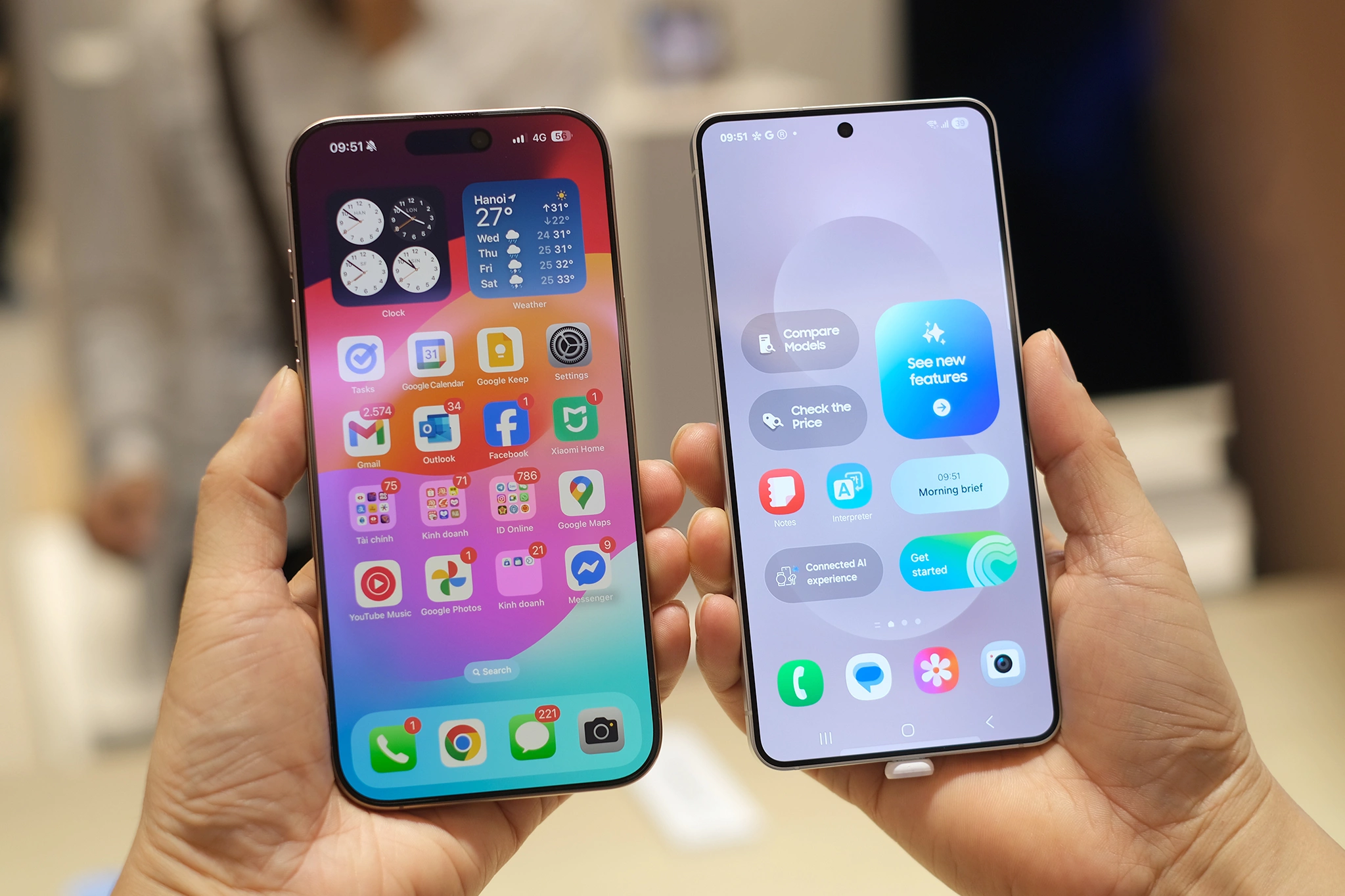 S25 Edge so độ mỏng với S25 Ultra (trái) và với iPhone 16 Pro Max (phải). Hai smartphone này đều dày khoảng 8,2 mm trong khi các điện thoại khác trên thị trường phổ biến ở mức 7-8,5 mm.