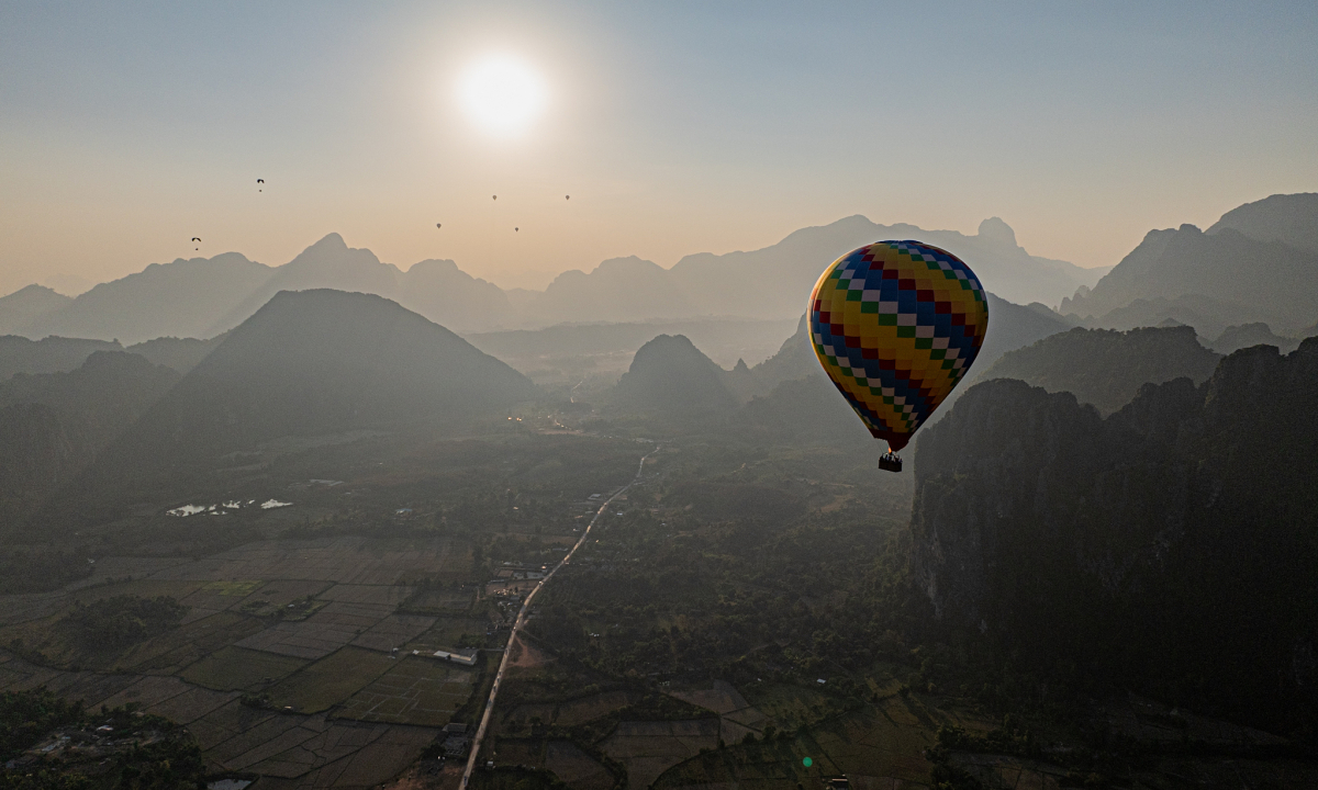 Một trong những trải nghiệm đáng giá nhất họ có là bay khinh khí cầu ở Vang Vieng, ngắm dãy núi đá vôi hùng vĩ và ruộng lúa bát ngát bên dưới. Giá mỗi lần bay khoảng 2,5 triệu đồng một người.