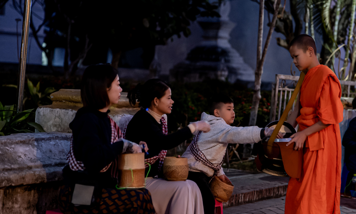 Đến Luang Prabang, cả nhà cũng dậy từ tờ mờ sáng để tham gia lễ khất thực của các nhà sư. Nghi lễ này diễn ra từ 5h30 tới 6h hàng ngày, thu hút đông đảo du khách và dân địa phương tham gia, đặc biệt trên đường Sakkaline và quanh khu vực chùa Wat Xieng Thong.
