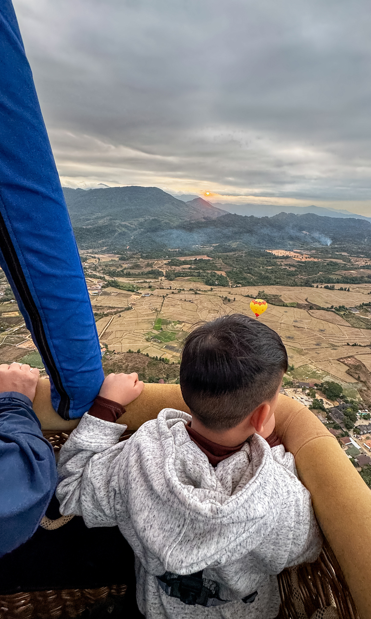 Các phượt thủ nhí ngắm Vang Vieng từ góc nhìn trên khinh khí cầu.