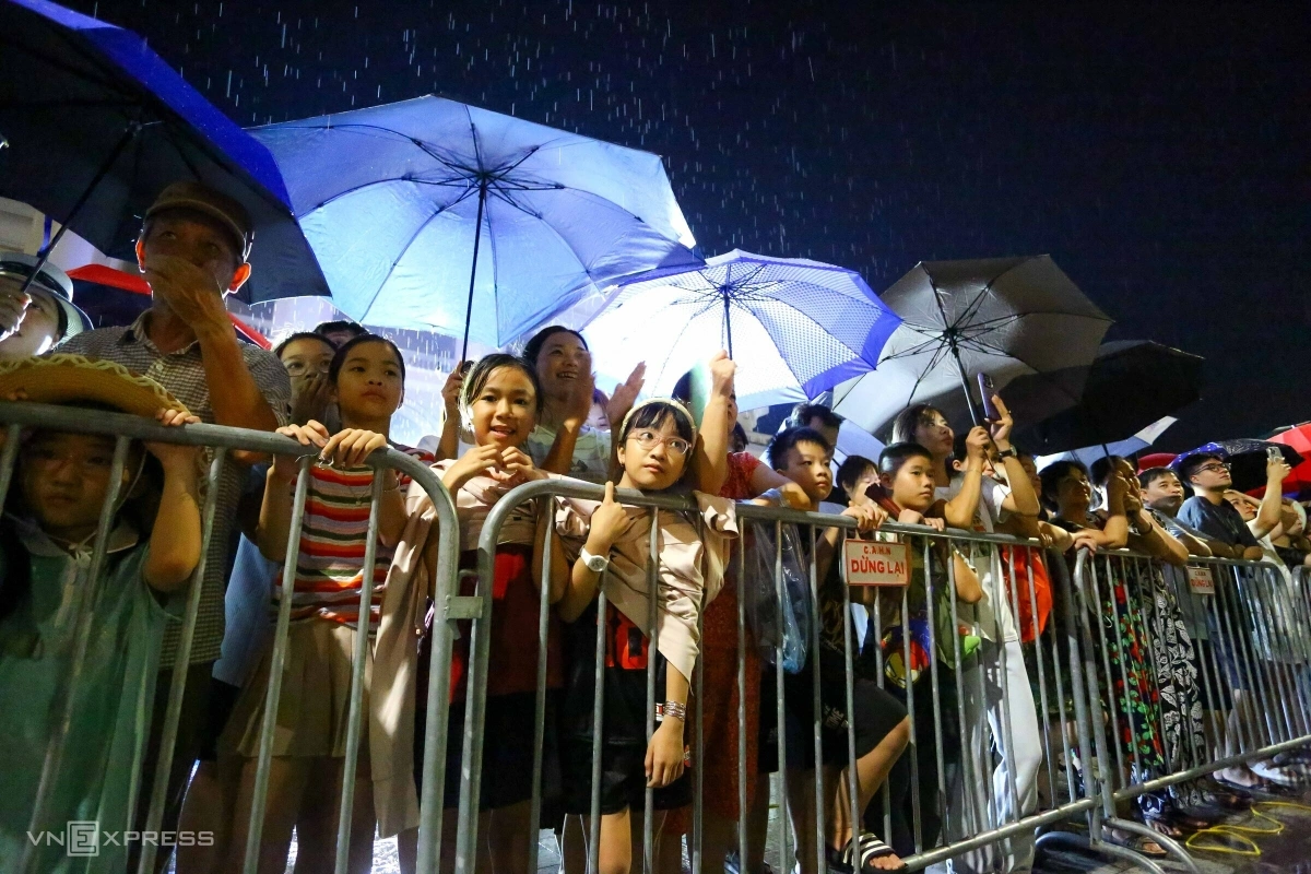 Dù trời mưa do ảnh hưởng bão, người dân vẫn kiên nhẫn chờ các đoàn rước đi qua. Lễ trao giải Hội thi mô hình đèn Trung thu sẽ tổ chức lúc 19h30 ngày 4/10.