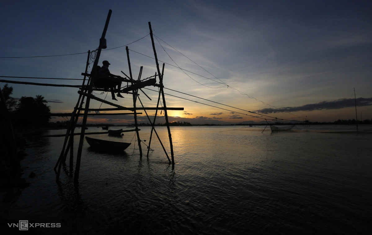 Đêm xuống, tấm lưới nằm dưới nước, phía trên được thắp đèn điện sáng để thu hút cá tôm. Ông Lê Văn Xí, 66 tuổi, xã Duy Nghĩa, huyện Duy Xuyên, cho biết trước đây ông dùng đèn măng xông thắp sáng bằng dầu nhưng nay chuyển sang dùng bóng điện.